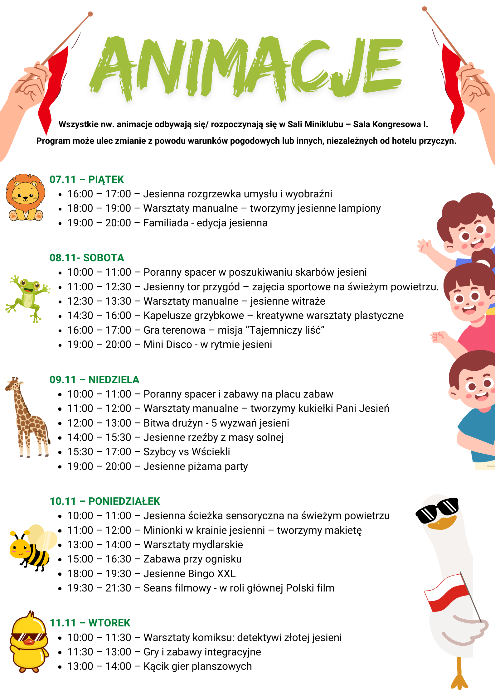 - Miniklub dla dzieci od lat 4 pod hasłem „Biało-czerwoni” – zapraszamy najmłodszych Gości na wyjątkowe zajęcia w naszym Miniklubie. Dzieci pod opieką animatorów wezmą udział w kreatywnych zajęciach inspirowanych barwami narodowymi. To doskonała okazja do wspólnej zabawy, rozwijania wyobraźni oraz tworzenia wyjątkowych prac w biało-czerwonym klimacie.